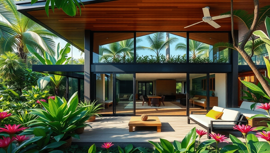 Incorporate native tropical plants, palms, shrubs, and water elements such as pools or ponds. Landscaping acts as a climate moderator and visual enhancer. Green courtyards or gardens inside the home footprint help bring nature indoors.