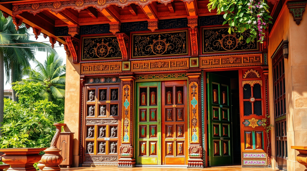 Chettinad homes blend elegance and strength. Made with lime, egg white plaster, and Burmese teak, these mansions exhibit artistic flooring and vast courtyards. Their symmetry and grand entrances symbolize prosperity and hospitality.