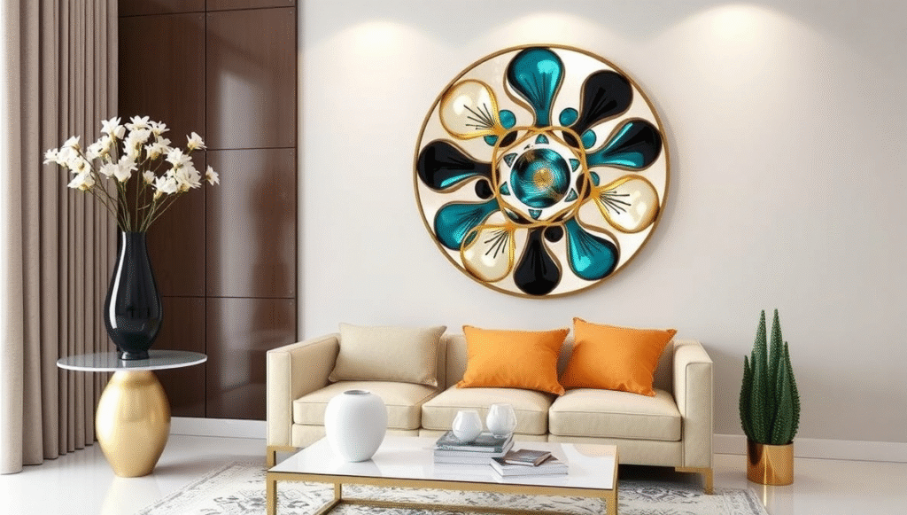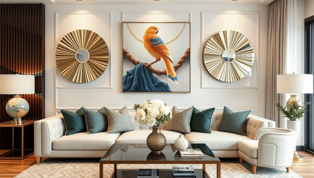 Use a mix of wall art, table showpieces, and decorative vases. Choose colors that match your furniture for a balanced look.